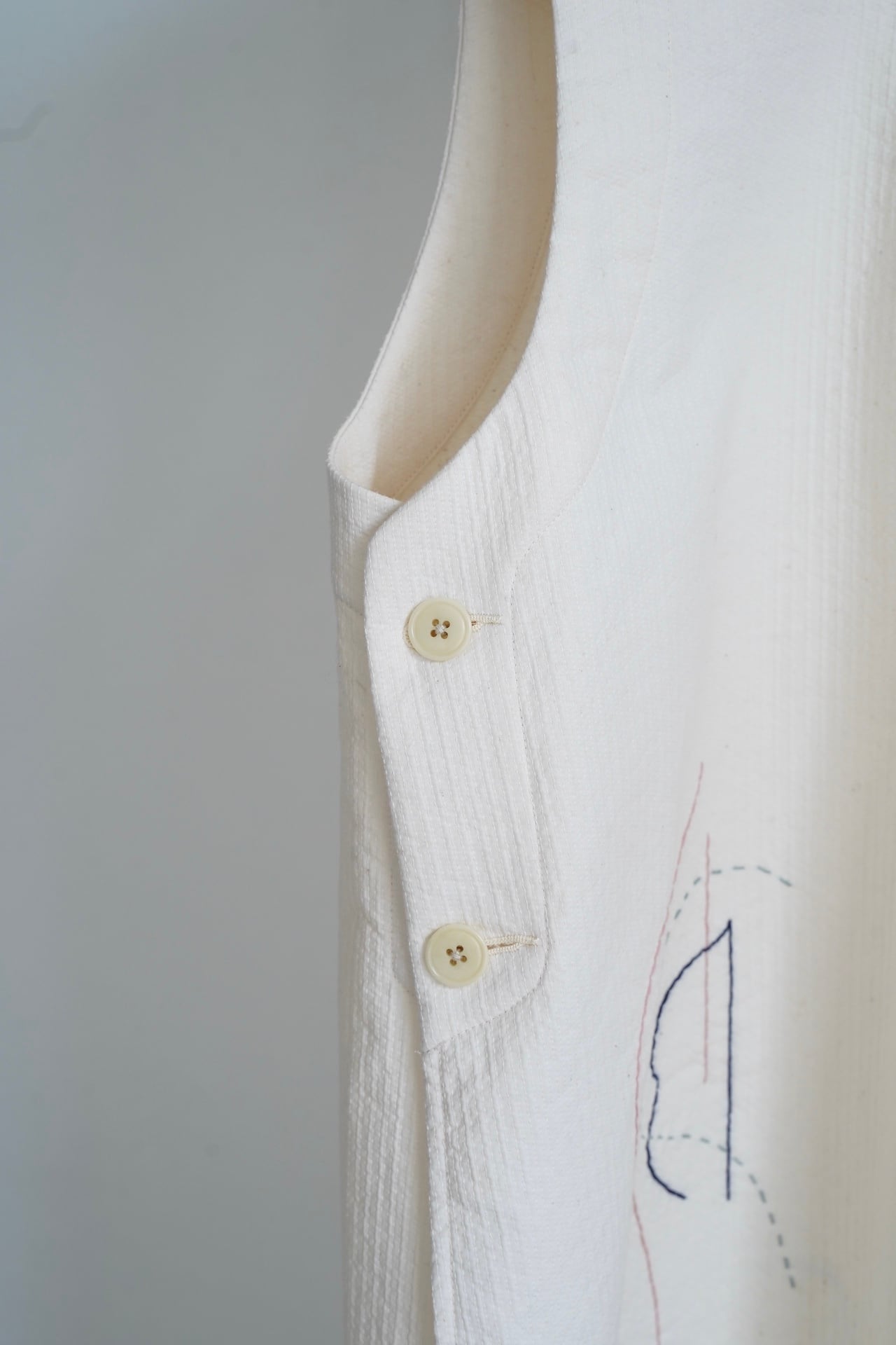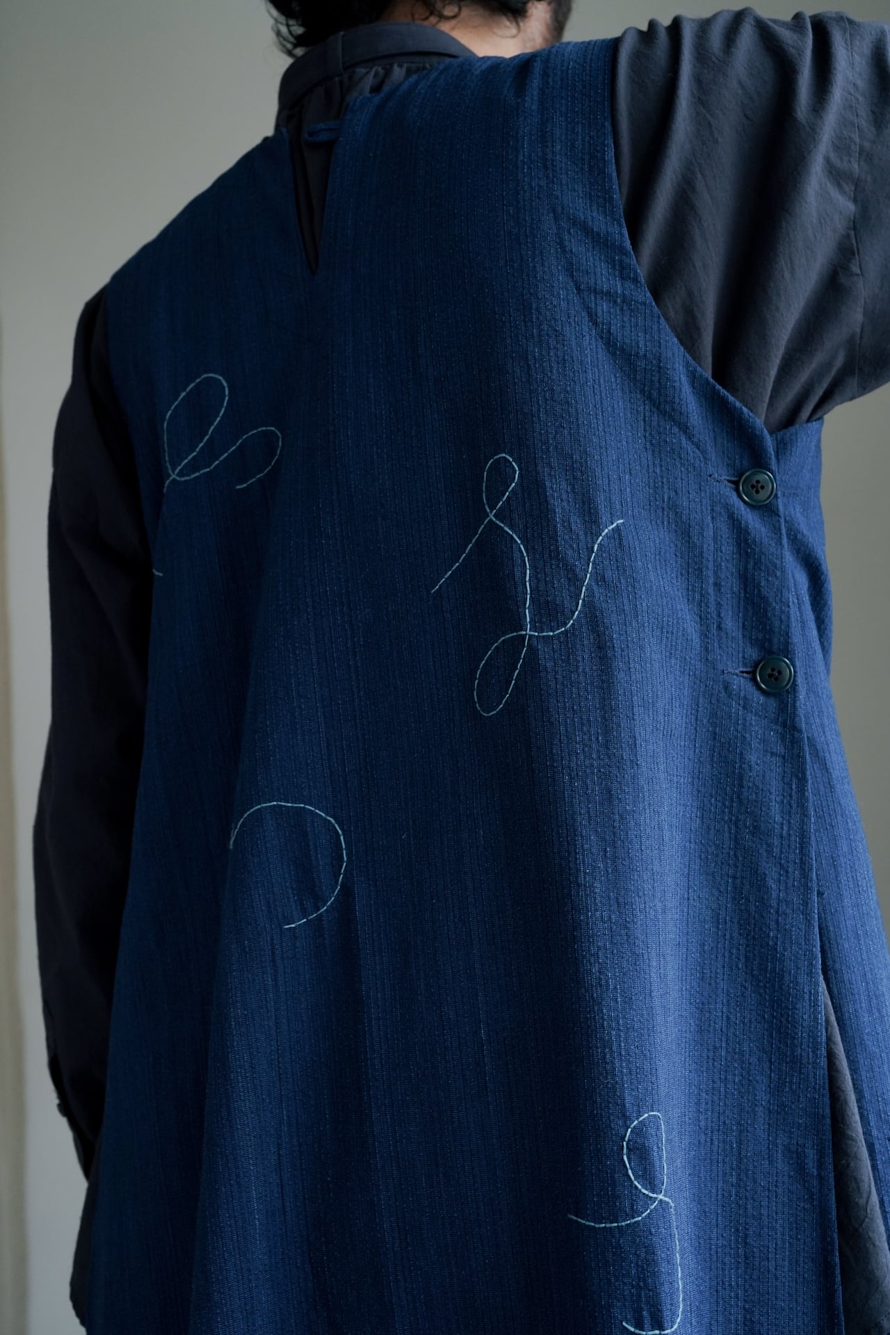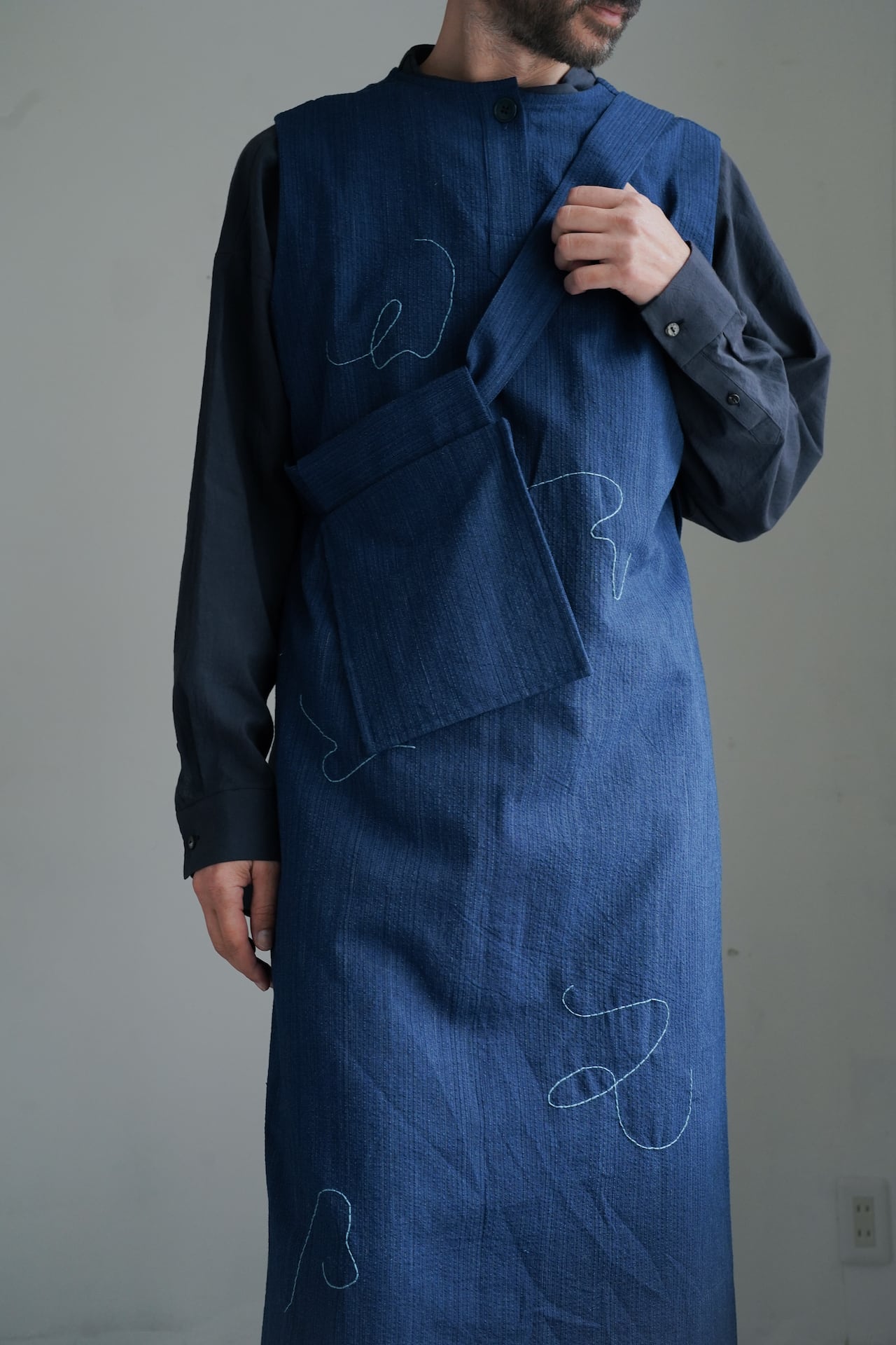 ECRUは刺し子のようなステッチを施し、表と裏で織のテンションに変化をつけて生地に凹凸を持たせたドビー素材です。INDIGOは日本三大絣の1つ、広島県の備後絣の90年代デッドストック。どちらも吸湿性に優れてた素材特性があり、夏場は涼しく、冬は繊維の中心部が空洞になっている成形から空気の層を作り、保温性を発揮します。。この温か味のある風合いの生地上に、刺繍作家 Baba Chisa による、手刺繍を施しました。ECRUには山や風、植物から連想されたモチーフを、INDIGOには自然や動物が動く軌道が描かれています。彼女が自然界からインスピレーションを受け作り上げる柔らかく温かい作品や色は、MARU TOのものづくりと親和性があります。