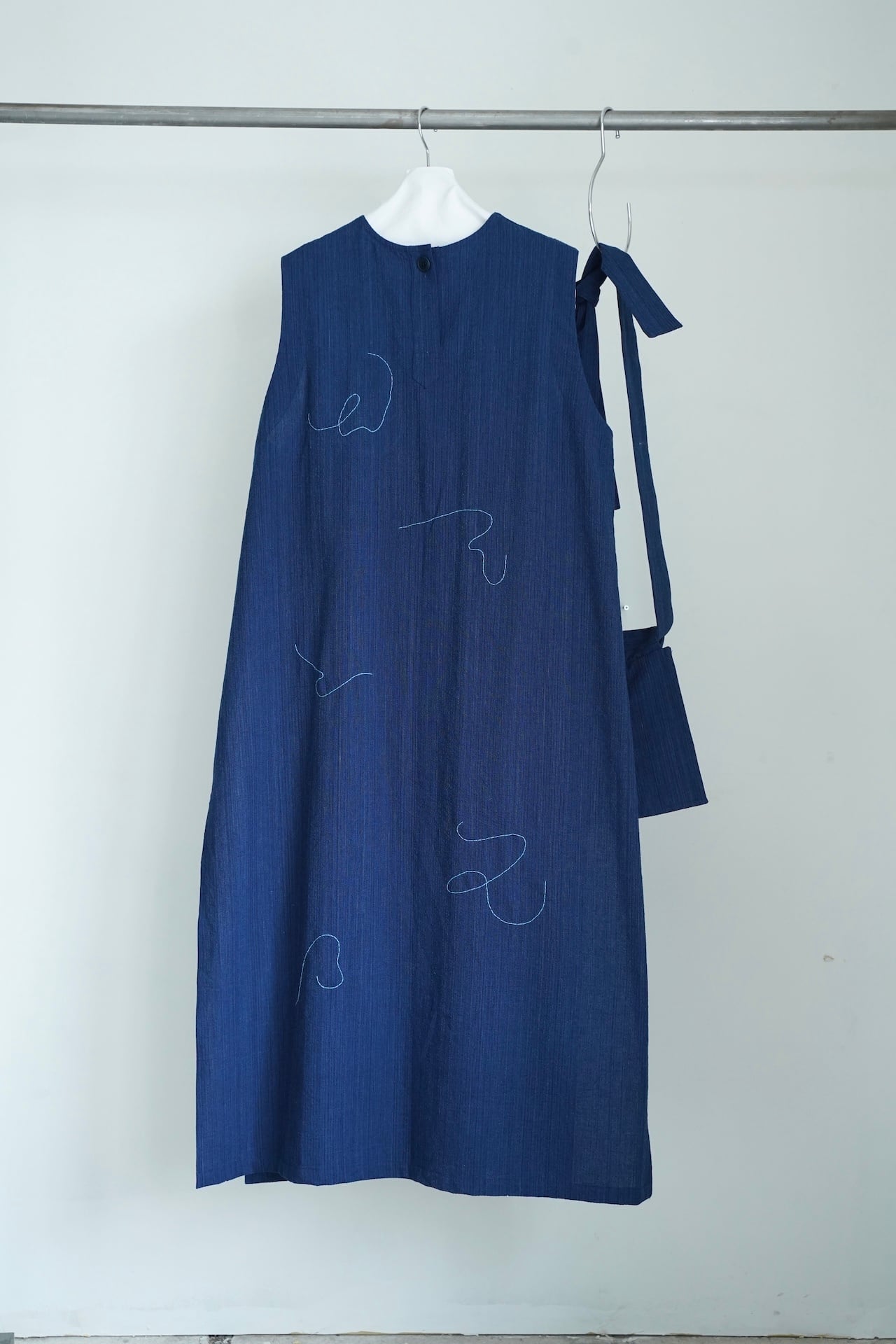 INDIGO … 木から地に向かって舞う葉っぱ。鳥が遠くに小さく飛んでいく様子。宙の民の軌道。糸の色は天井のない空