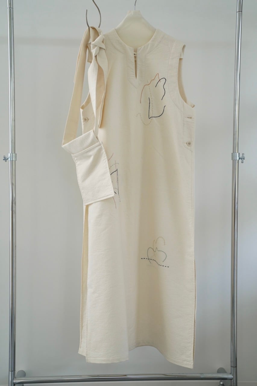 エプロンとしても万能な、ワンピースエプロンです。付属のポシェットは、肩からかけたりウェストに回したりと、ポケットとして使用します。膝上丈のMサイズ、ドレス丈のLサイズのレングス違いです。また、前後反対にして着用もできます。