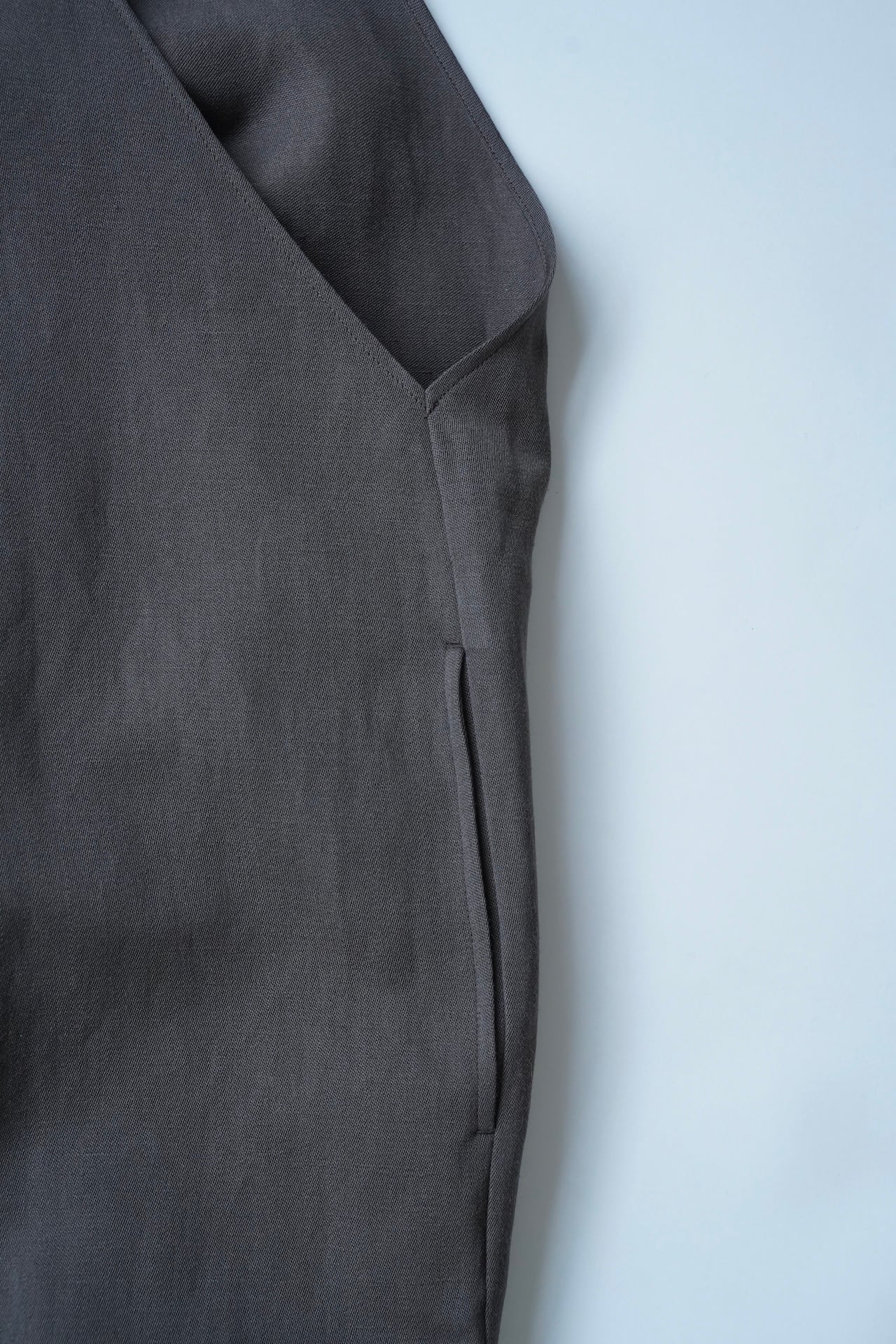 オーストラリアで工程の全てを行っている上質なウールと、国内のリネン糸で織られたツイル生地です。カジュアルさと艶感が共存している生地は控えめにも存在感があり、ブラウスやシャツなど綺麗に合わせるのはもちろん、Tシャツなどにラフに合わせても、上品さのある佇まいです。