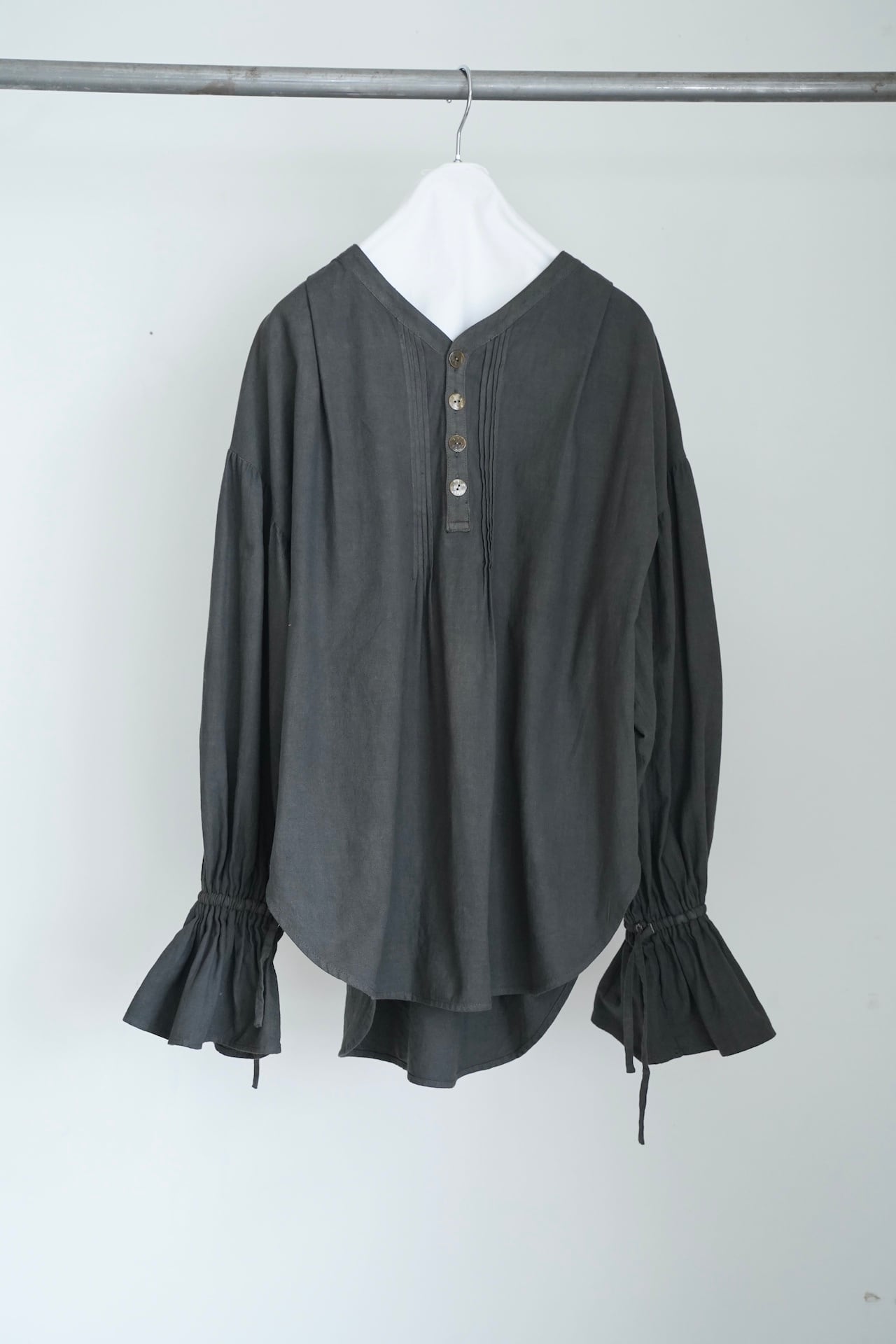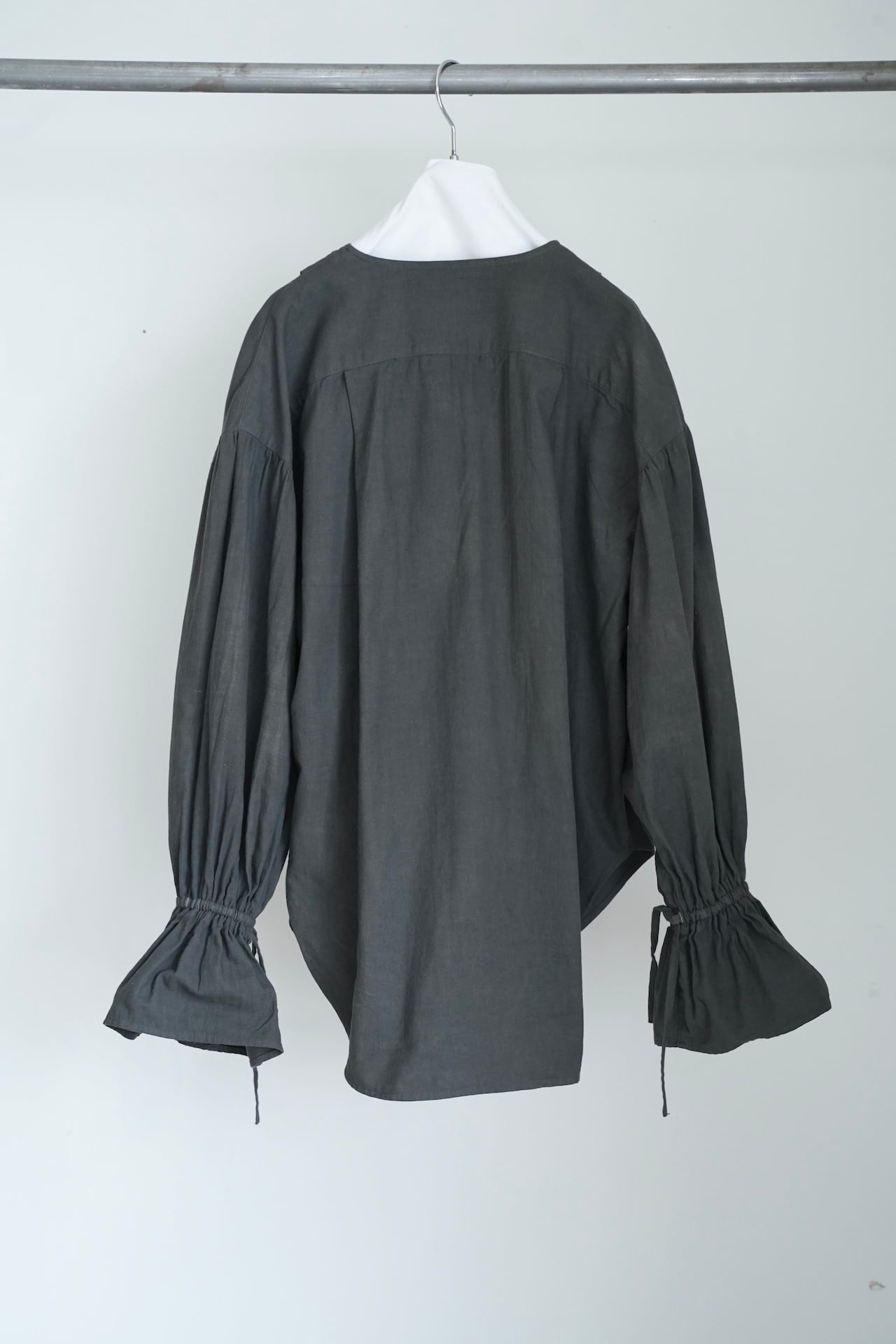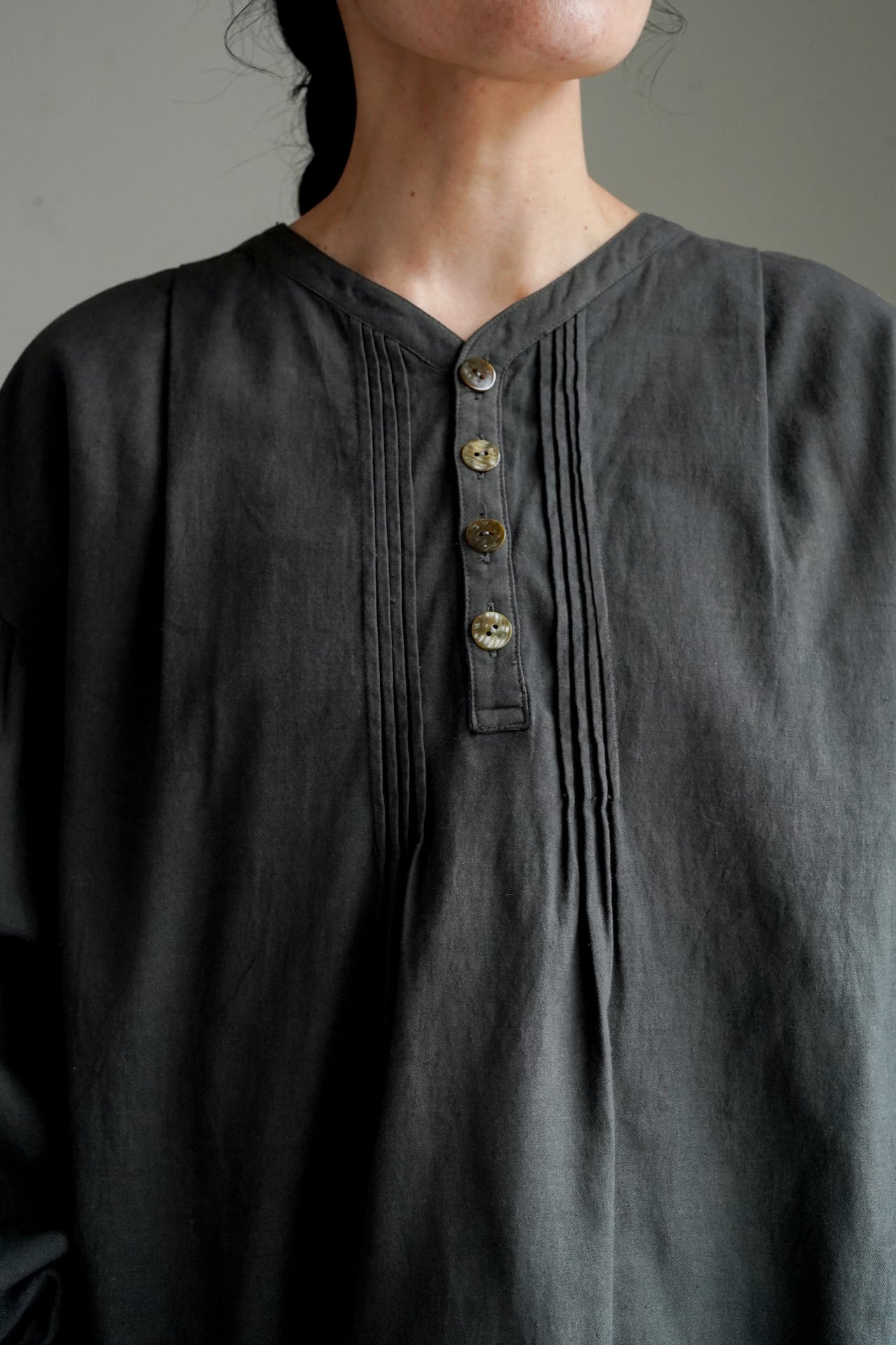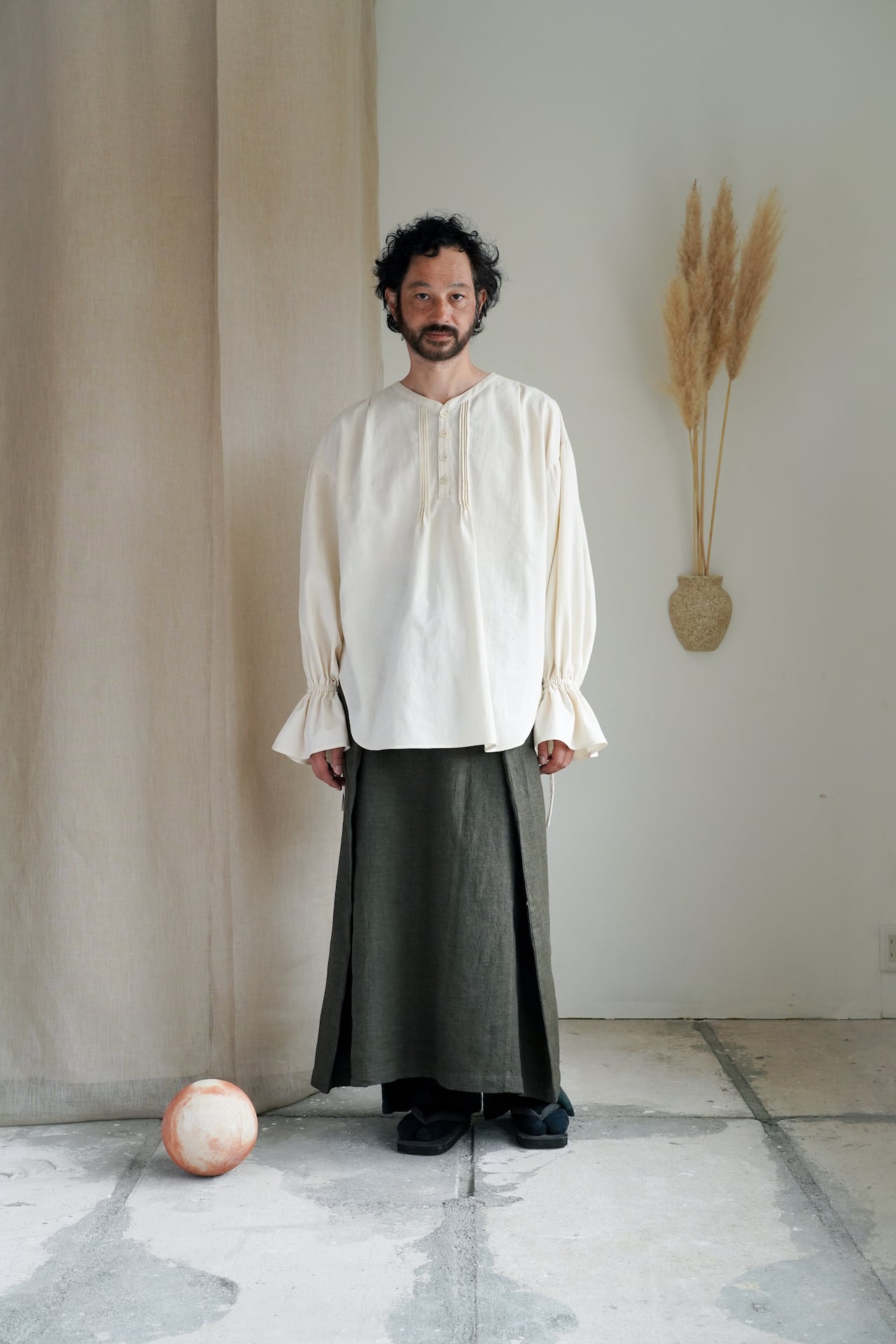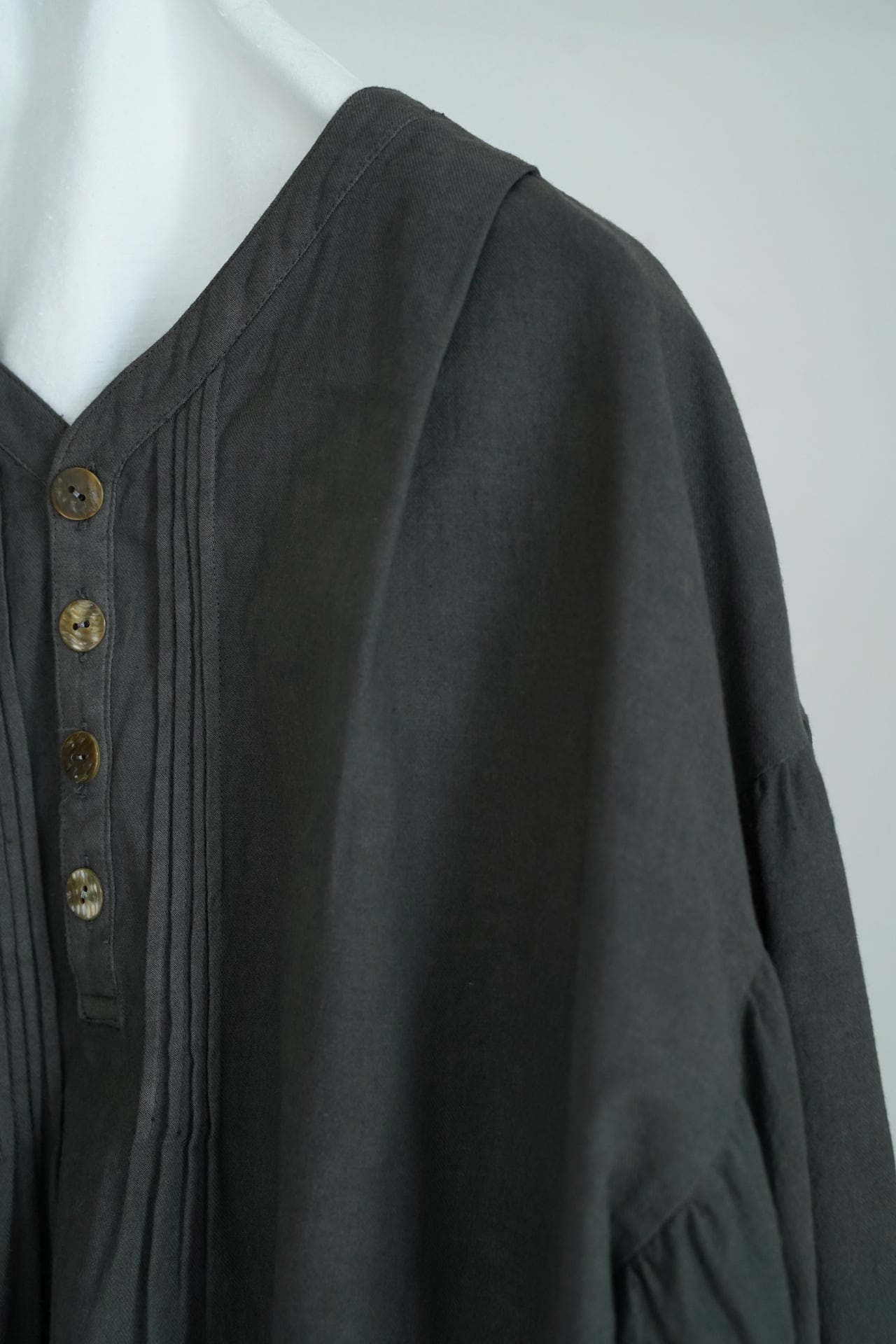 ピンタック、たっぷりボリュームを出したスリーブのフェミニンな雰囲気漂うフレンチカジュアルの定番、グランパシャツです。素材は少しカジュアルさを持たせ、着心地の良さ、使いやすさを重視したウール混のコットンビエラです。