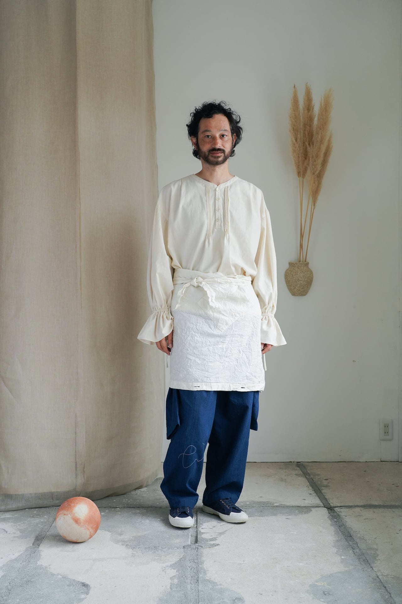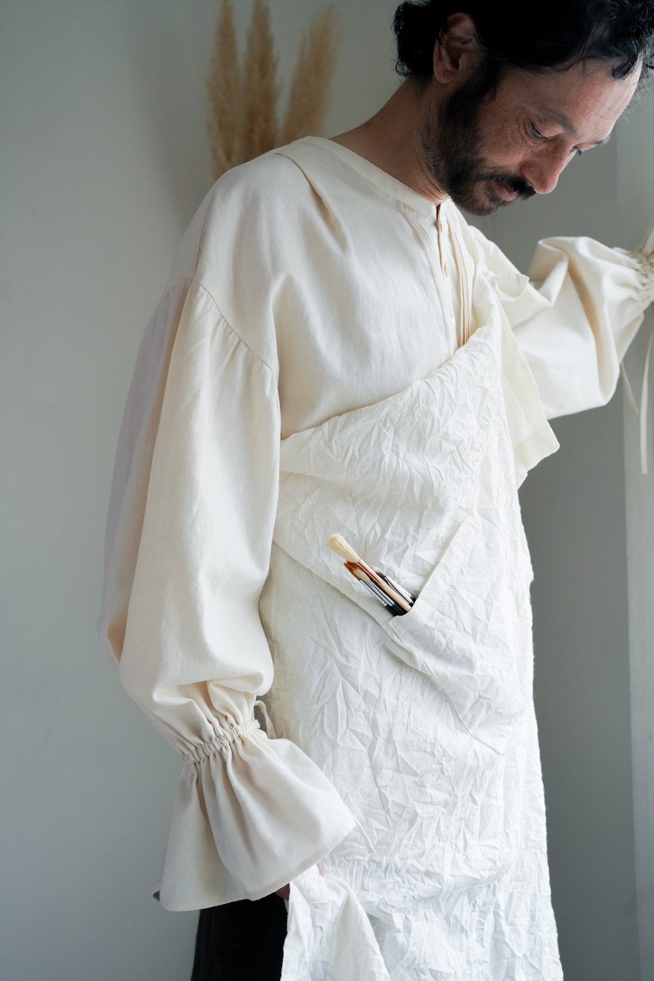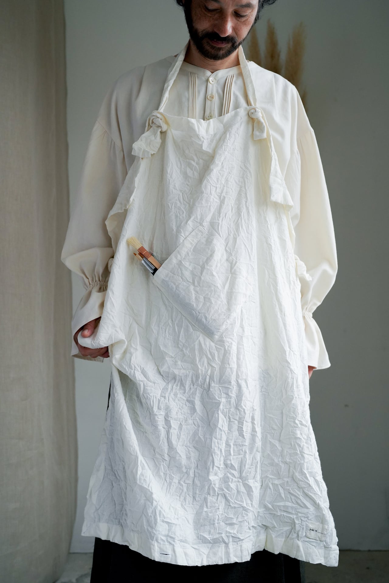 ランダムに皺がよる、キャッチワッシャー加工を施したエプロン。