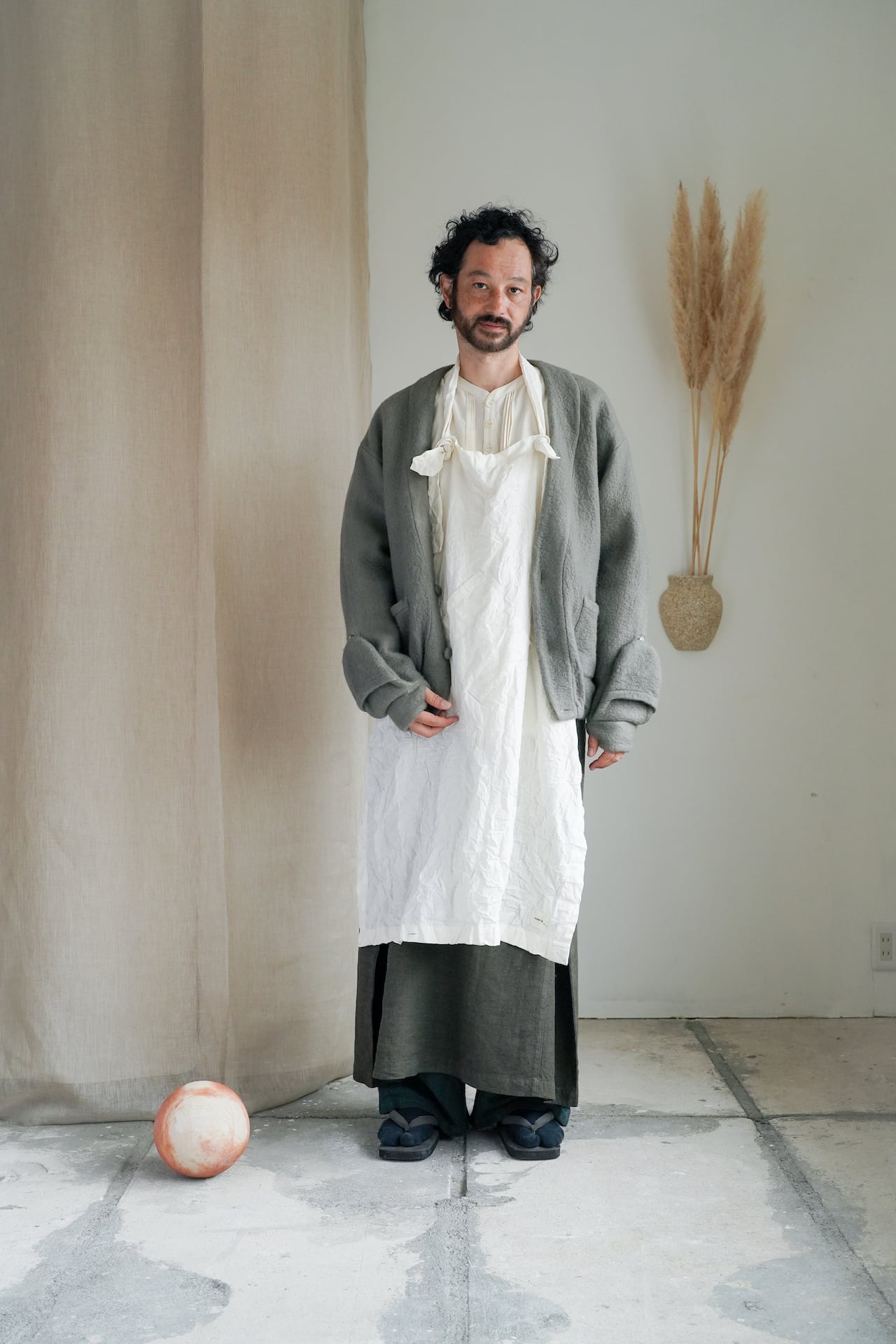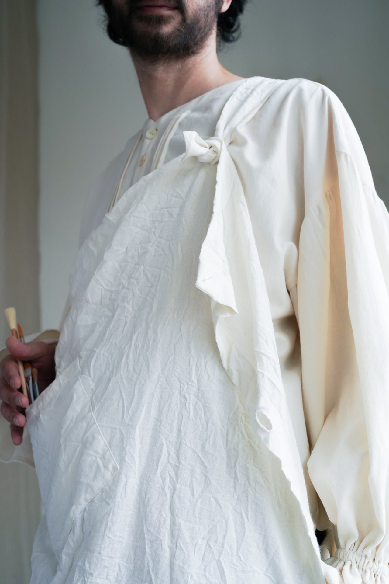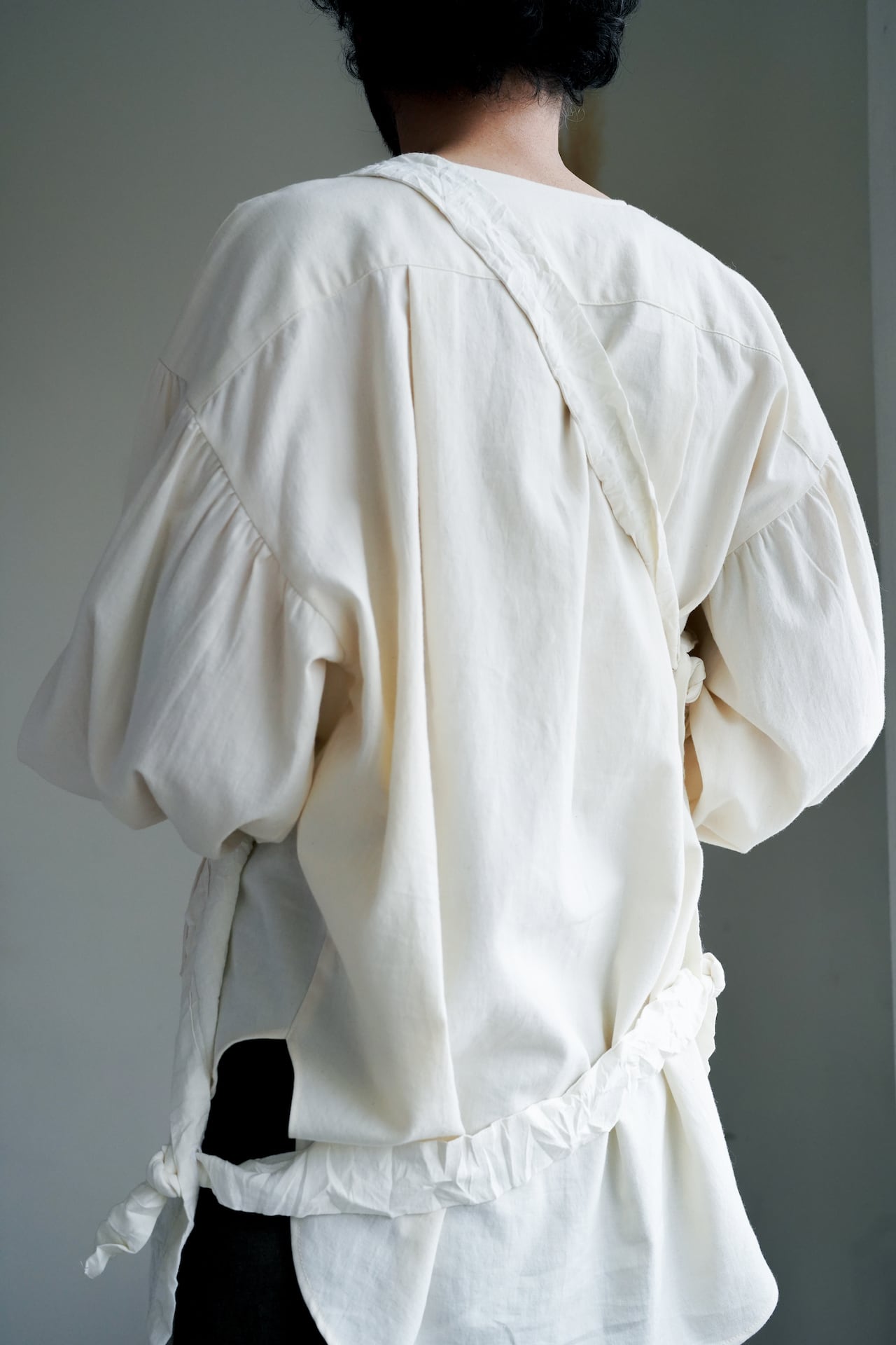 適当に扱っても、成り立ってしまうような、そんな願望を叶えるエプロンは、着方も着る人次第。本体の周りの10個のホールに好きに紐を通して、縦にも横にも斜めにも着用でき、自分の好みの着方を見つけるのも楽しさもあるエプロンです。