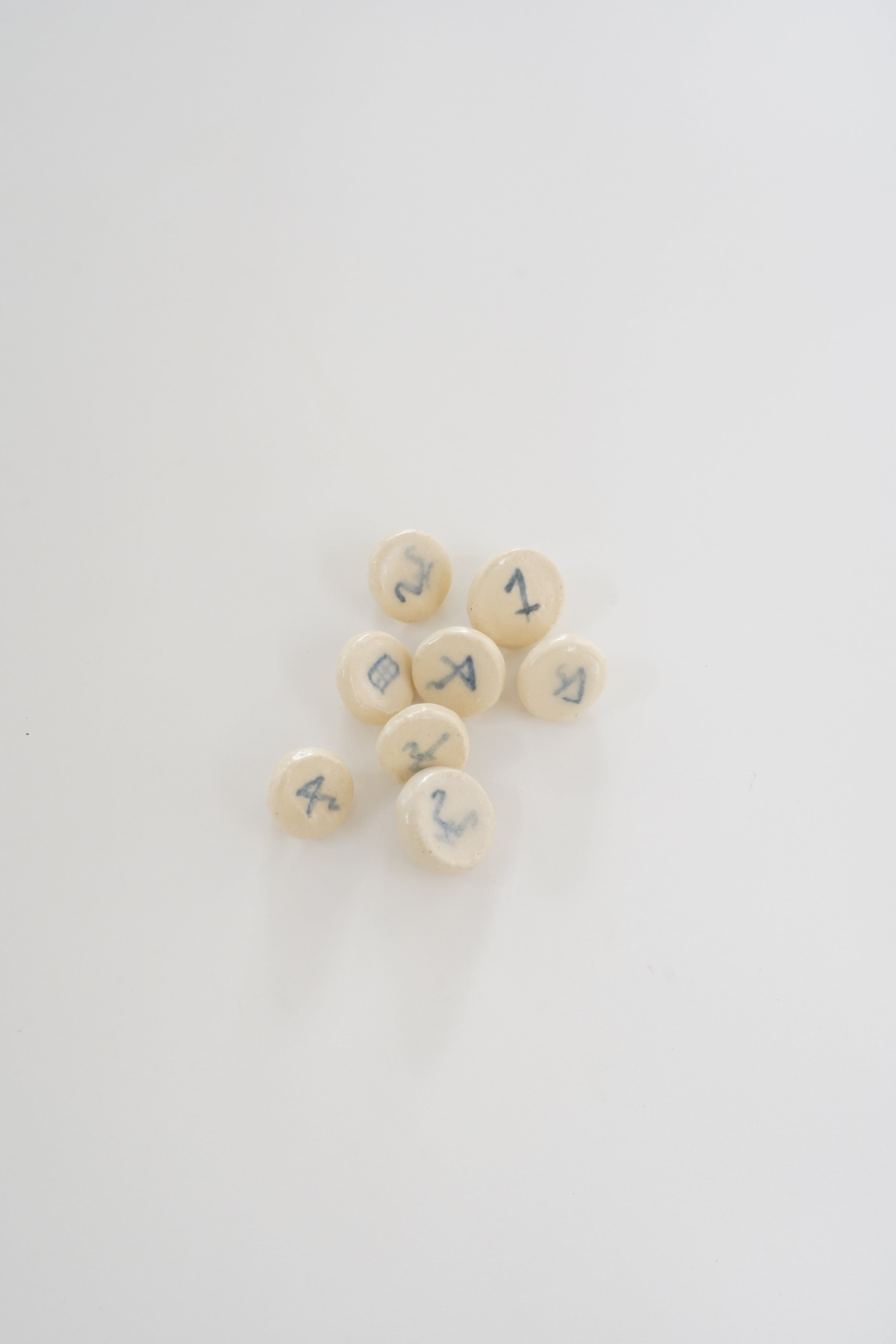 北欧で昔使われていた染色の時に用いる記号を、呉須という古代中国伝来の青い顔料で描いてもらっています。