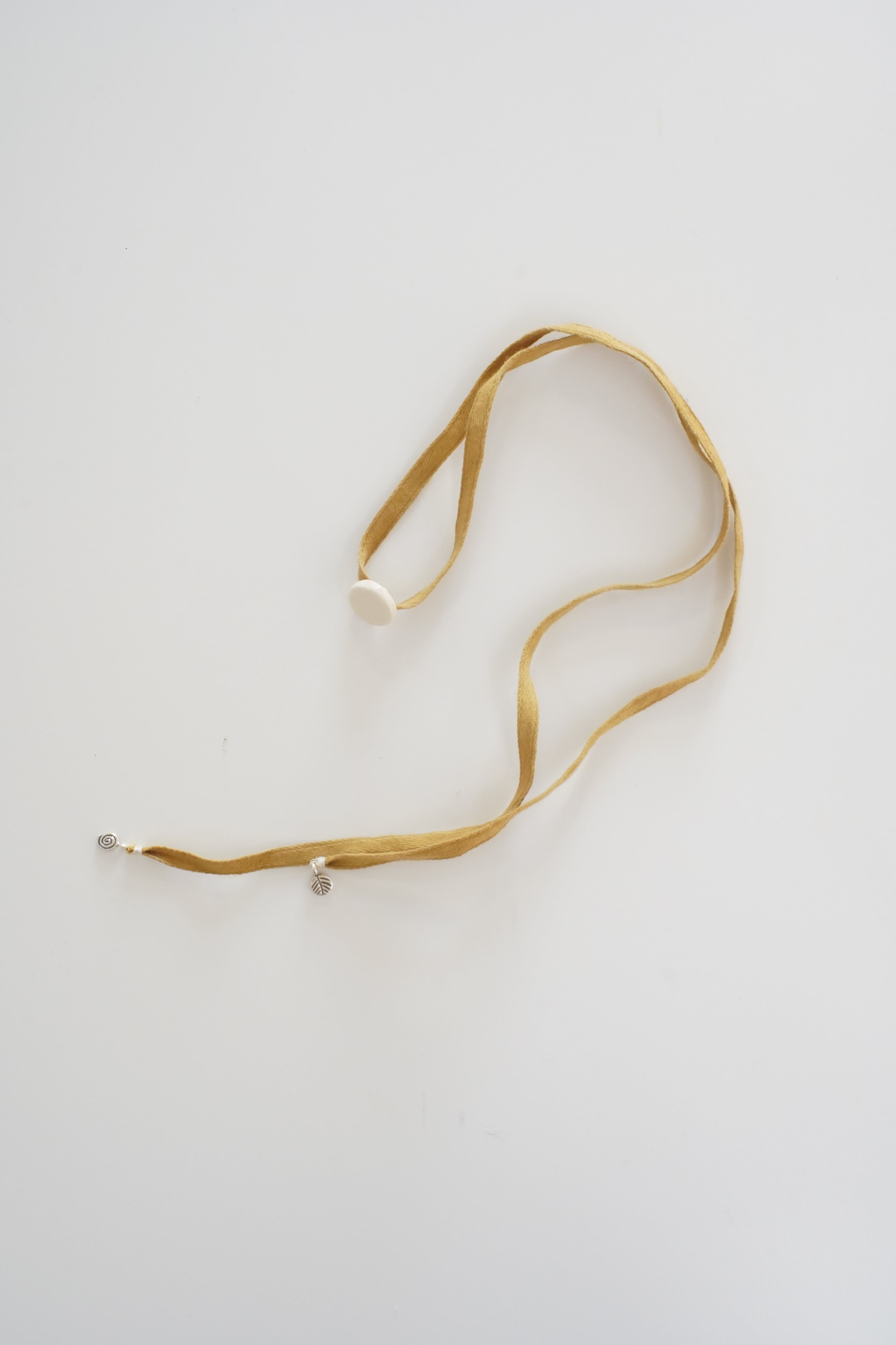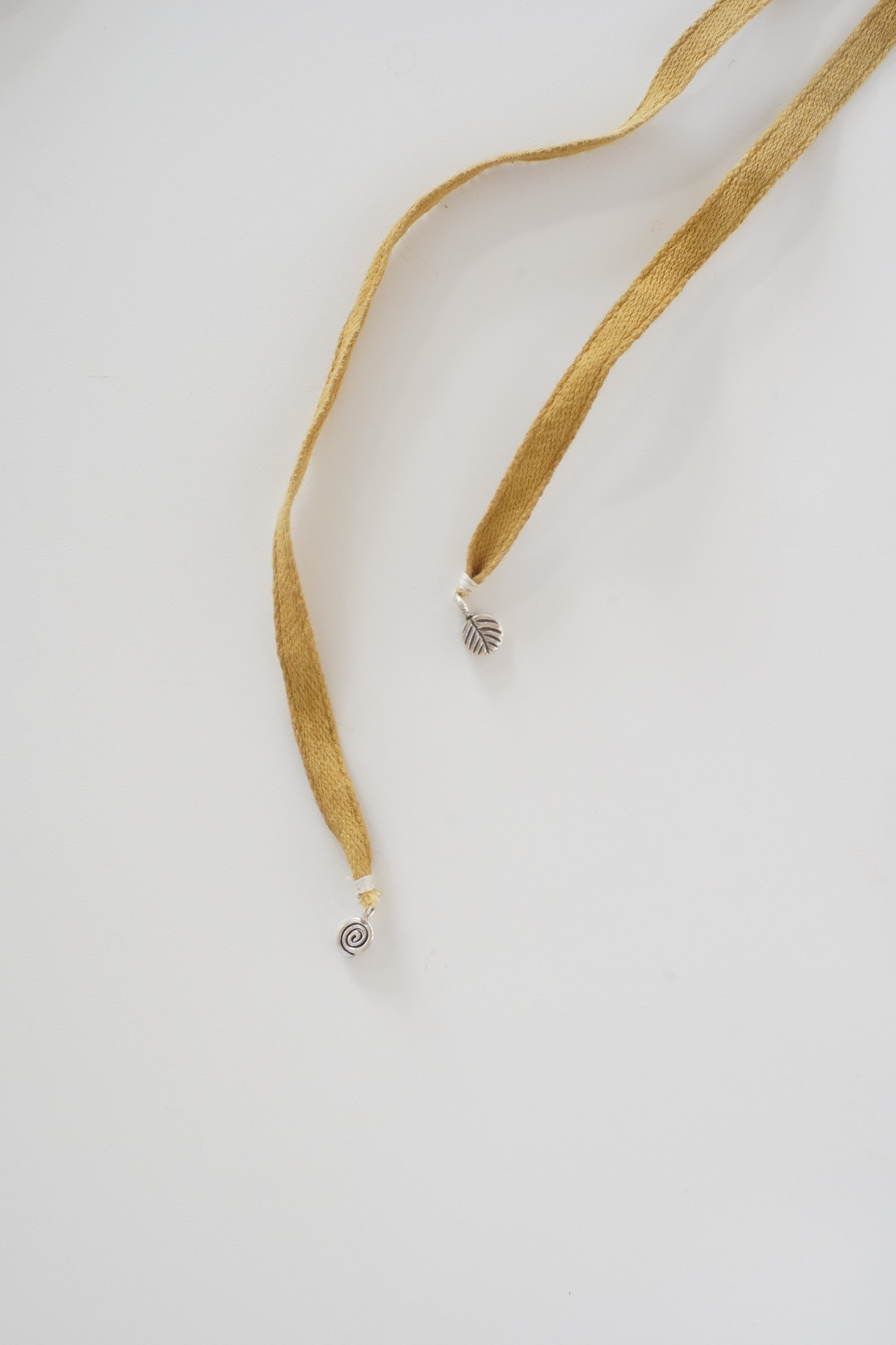 オーガニックコットンのリボンをさまざまな植物から色を取り出し染めています。