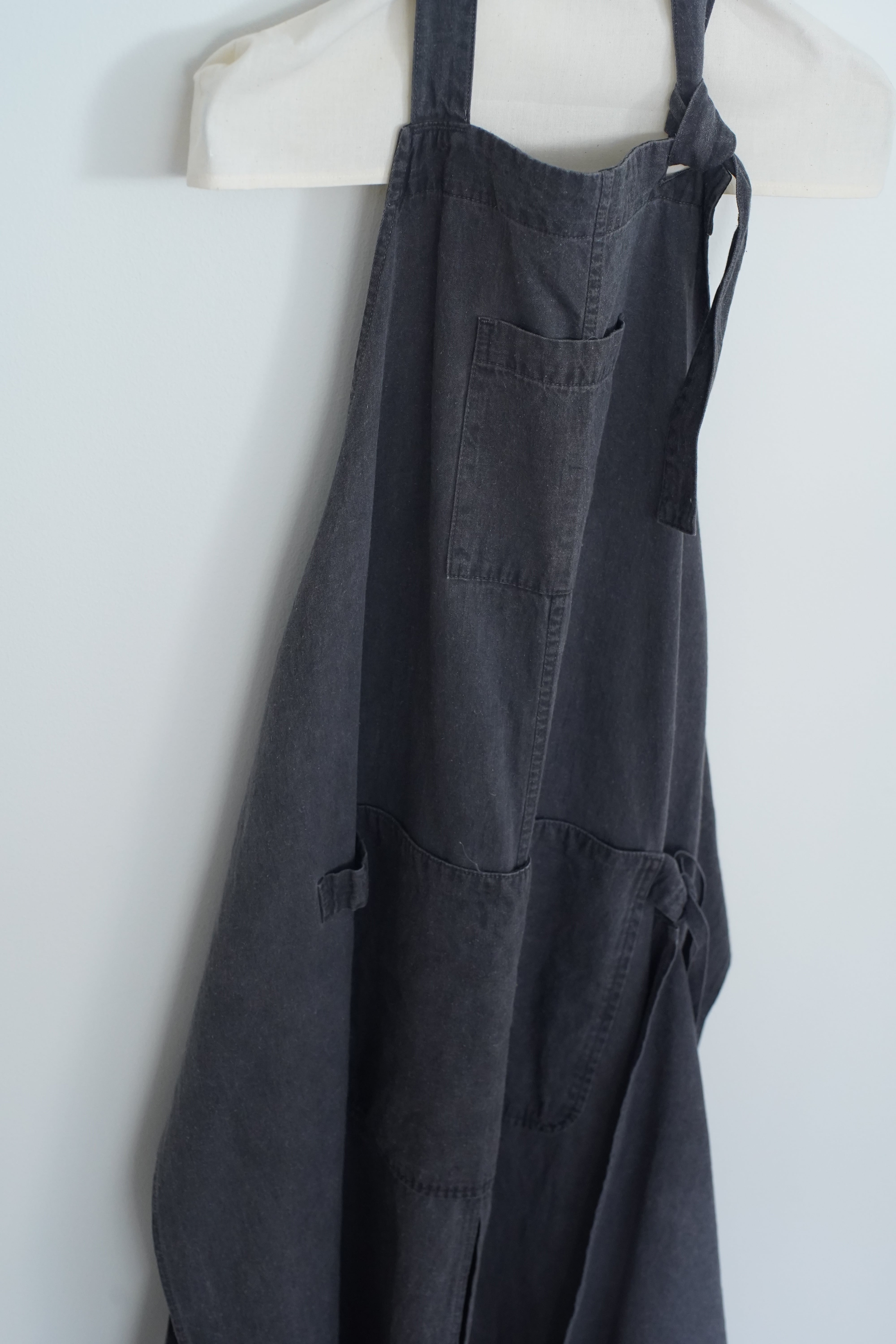 MARU TOのエプロンの中では一番着丈が長めで胸辺りの生地面積も大きめなのでしっかり洋服を保護してくれます。カバー力があり、プロ向けとしてもおすすめのタイプ。小柄な女性から大柄な男性まで着用いただけます。