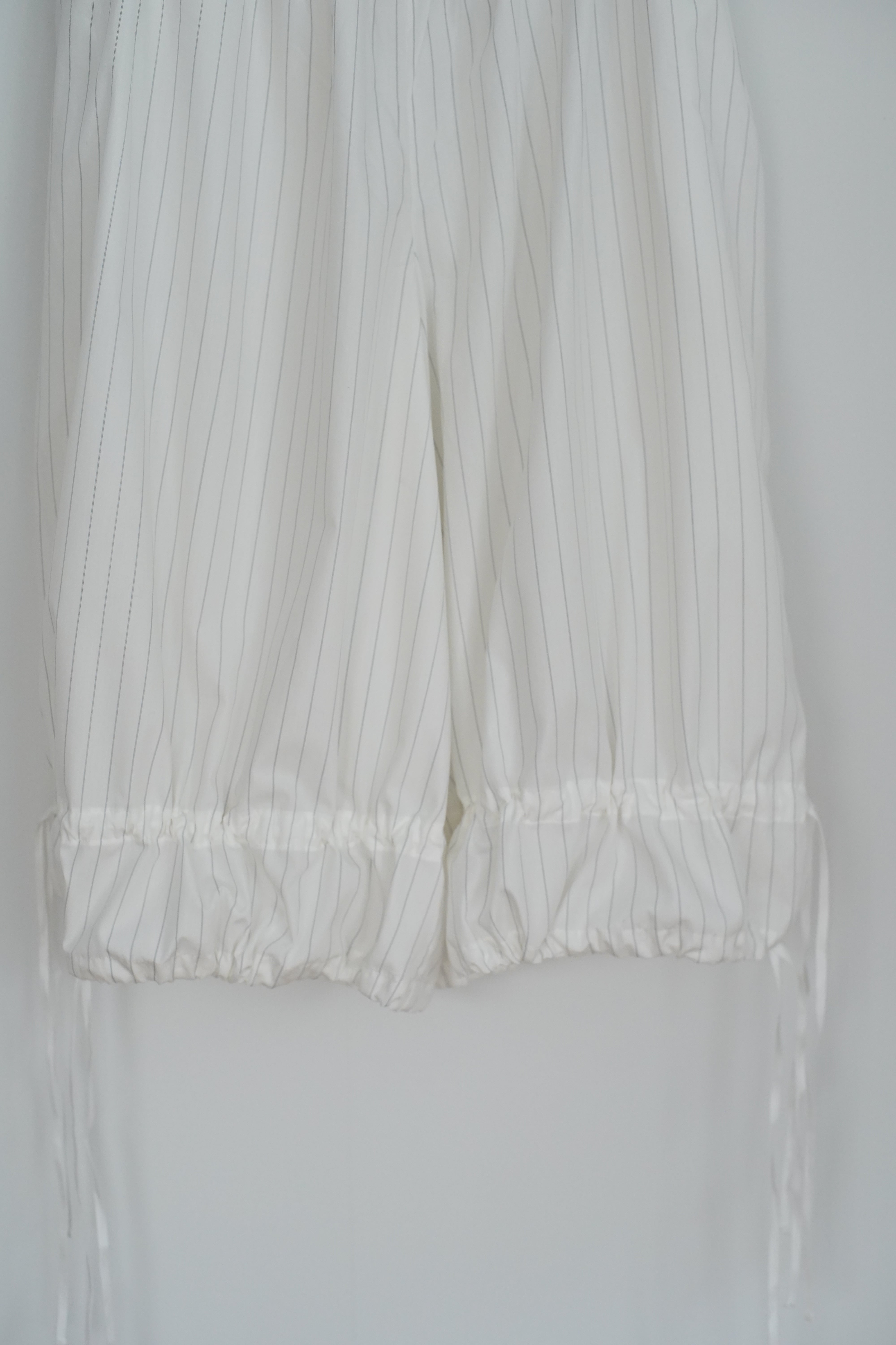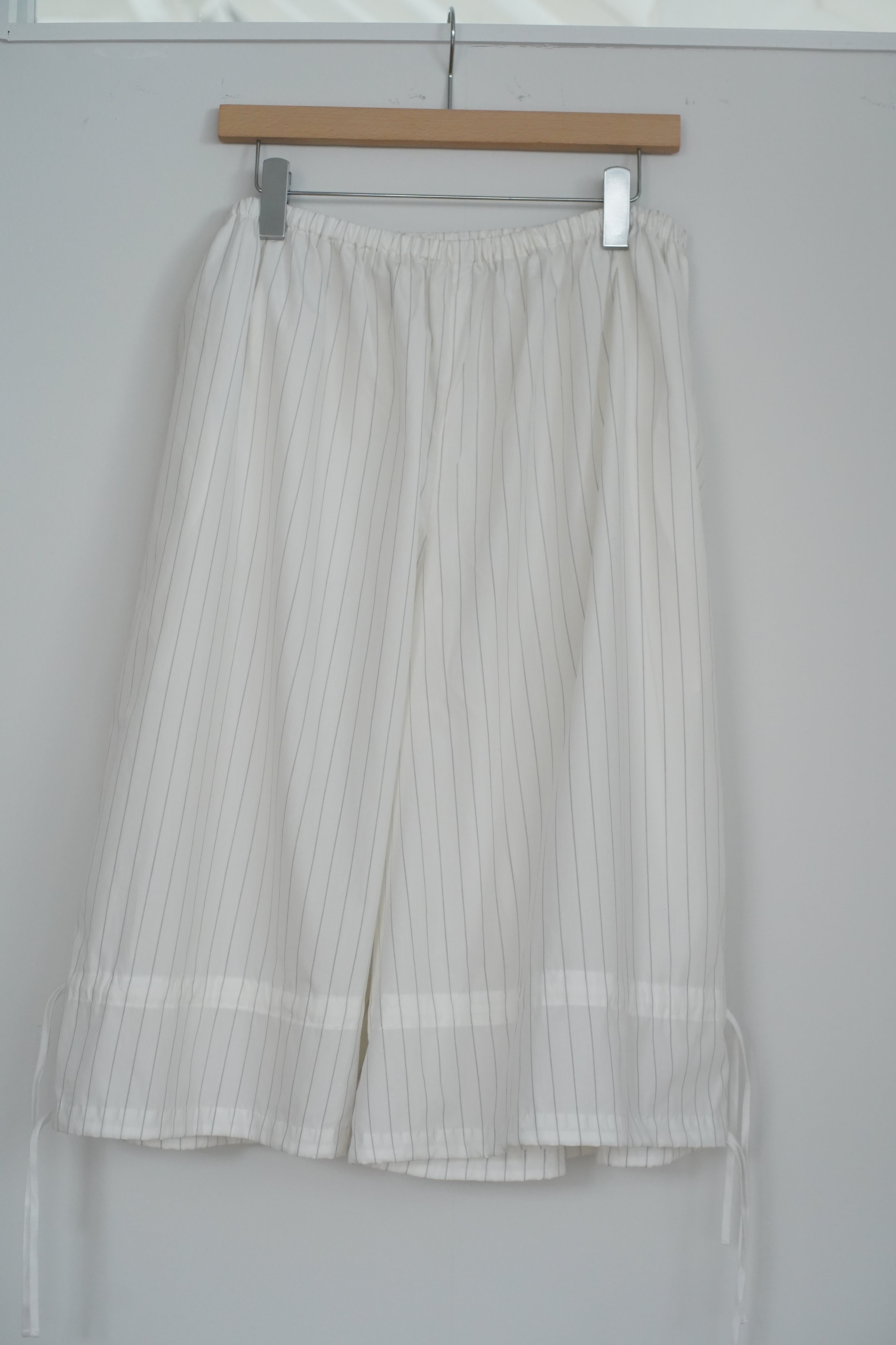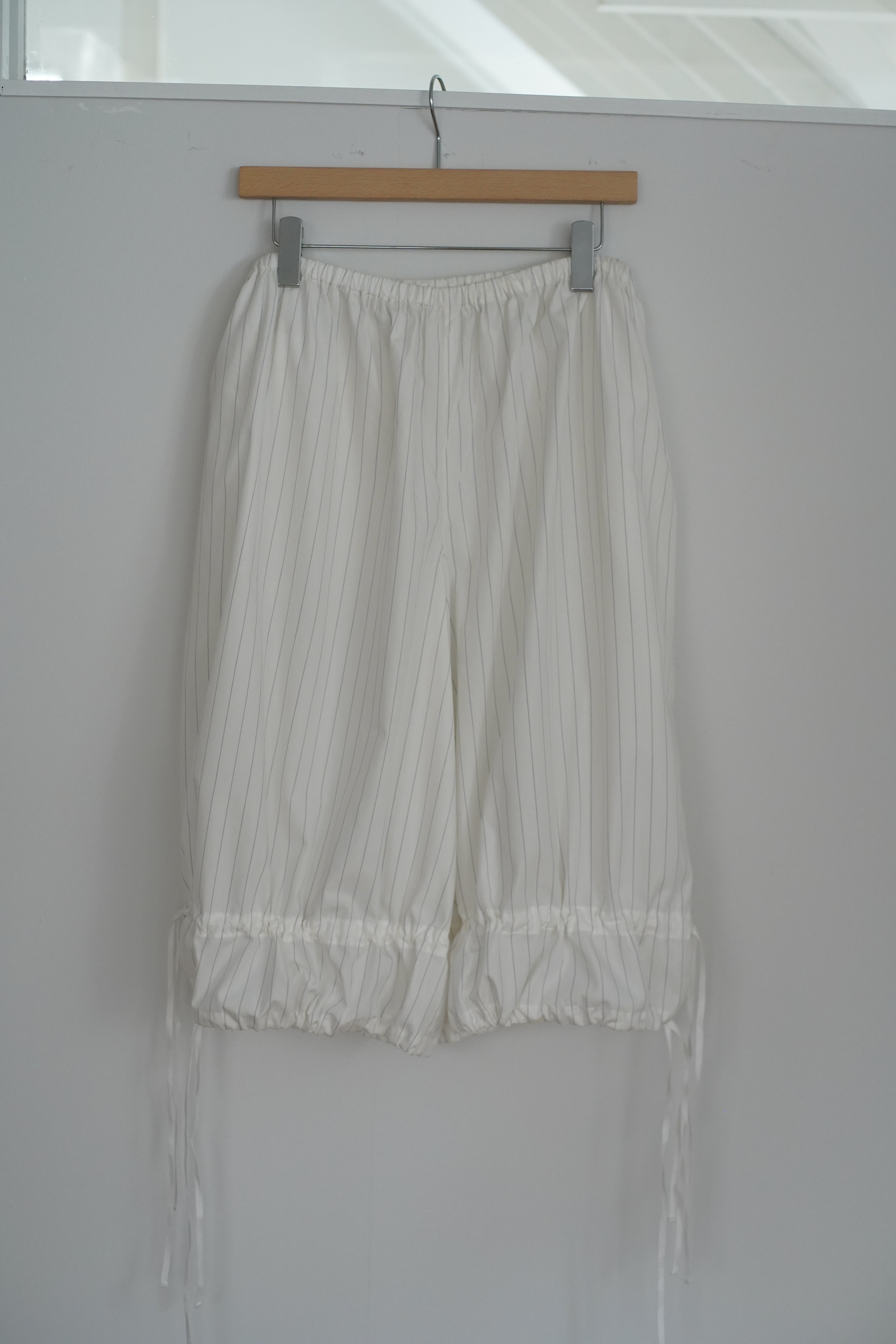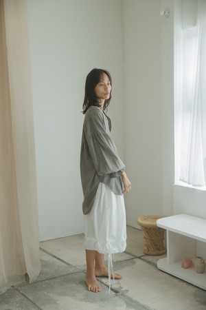 裾と少し上に紐が2本通っていて、絞ったり、絞らなかったり、上だけ絞ってみたり、クシュっとさせてアレンジを楽しめるパンツになっています。