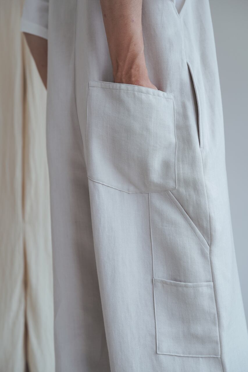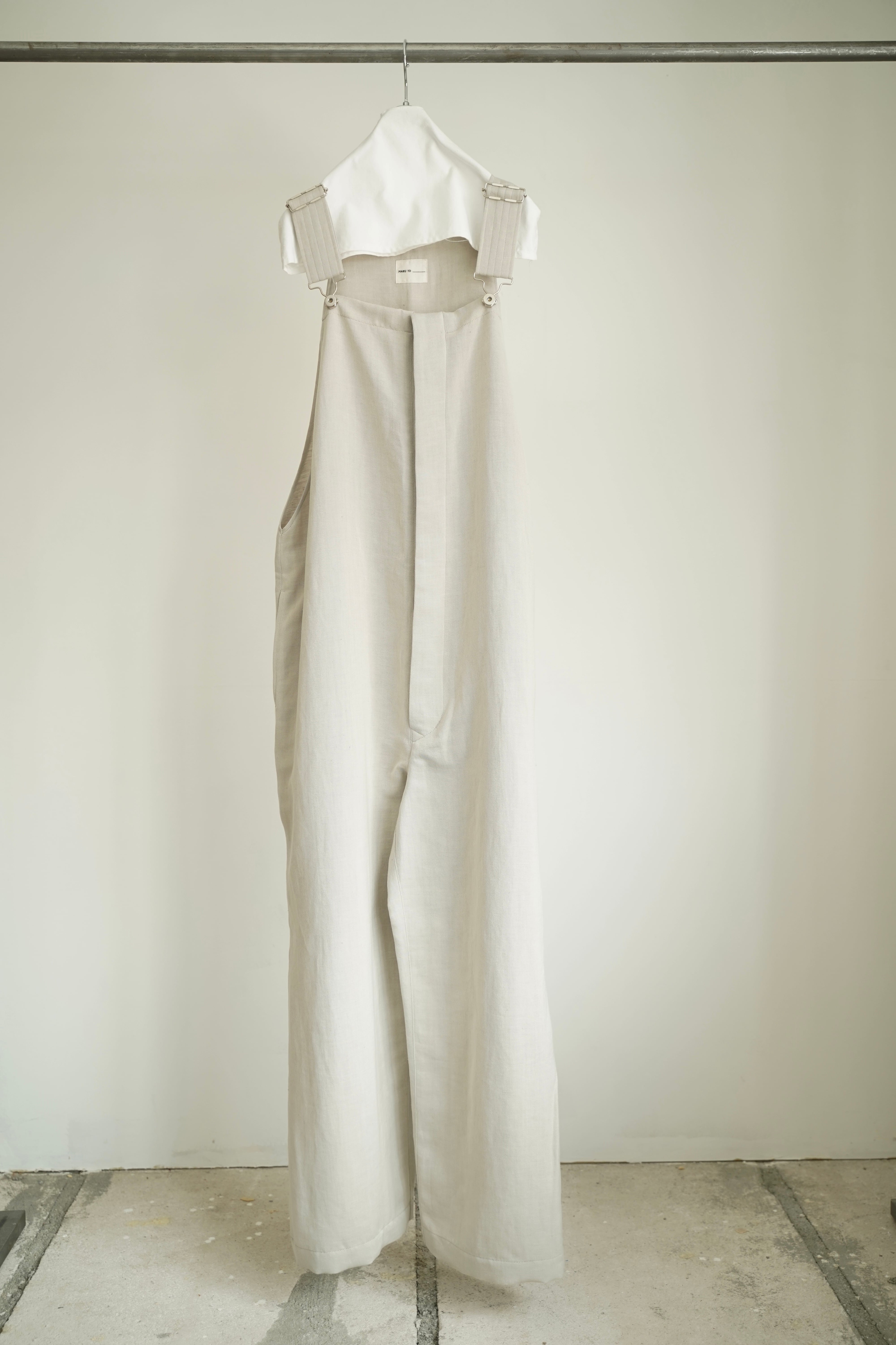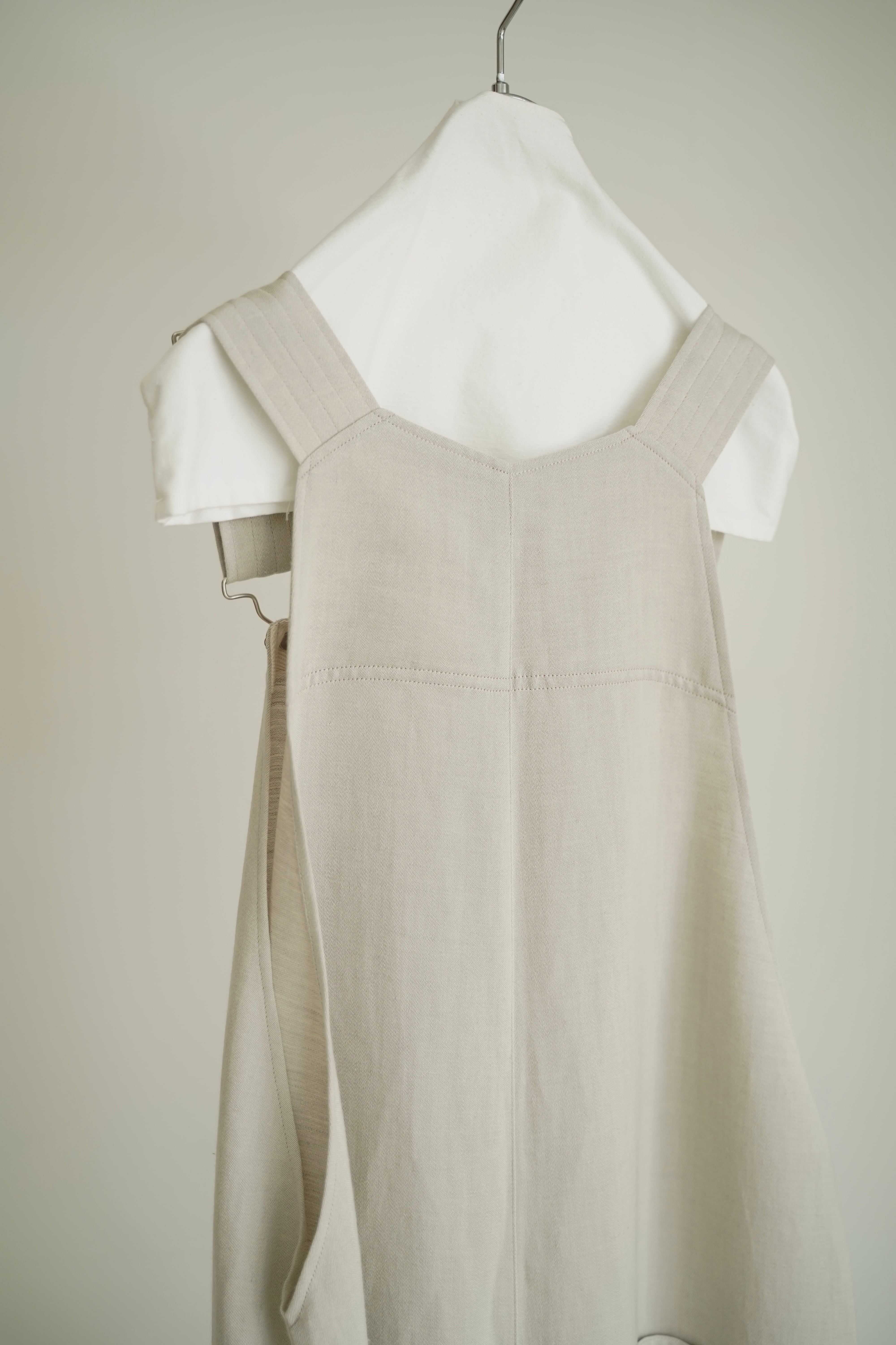 素材を変えたり、その時々でディテールも少しづつ変化する定番型のオーバーオール。カジュアルすぎないシンプルな作りに定評があります。オーストラリアにて工程の全てを行っている上質なウールと国内のリネン糸で織られたツイル生地。カジュアルさと艶感が共存している生地は控えめにも存在感があるのでTシャツなどにラフに合わせても、どこか上品さのある佇まいです。