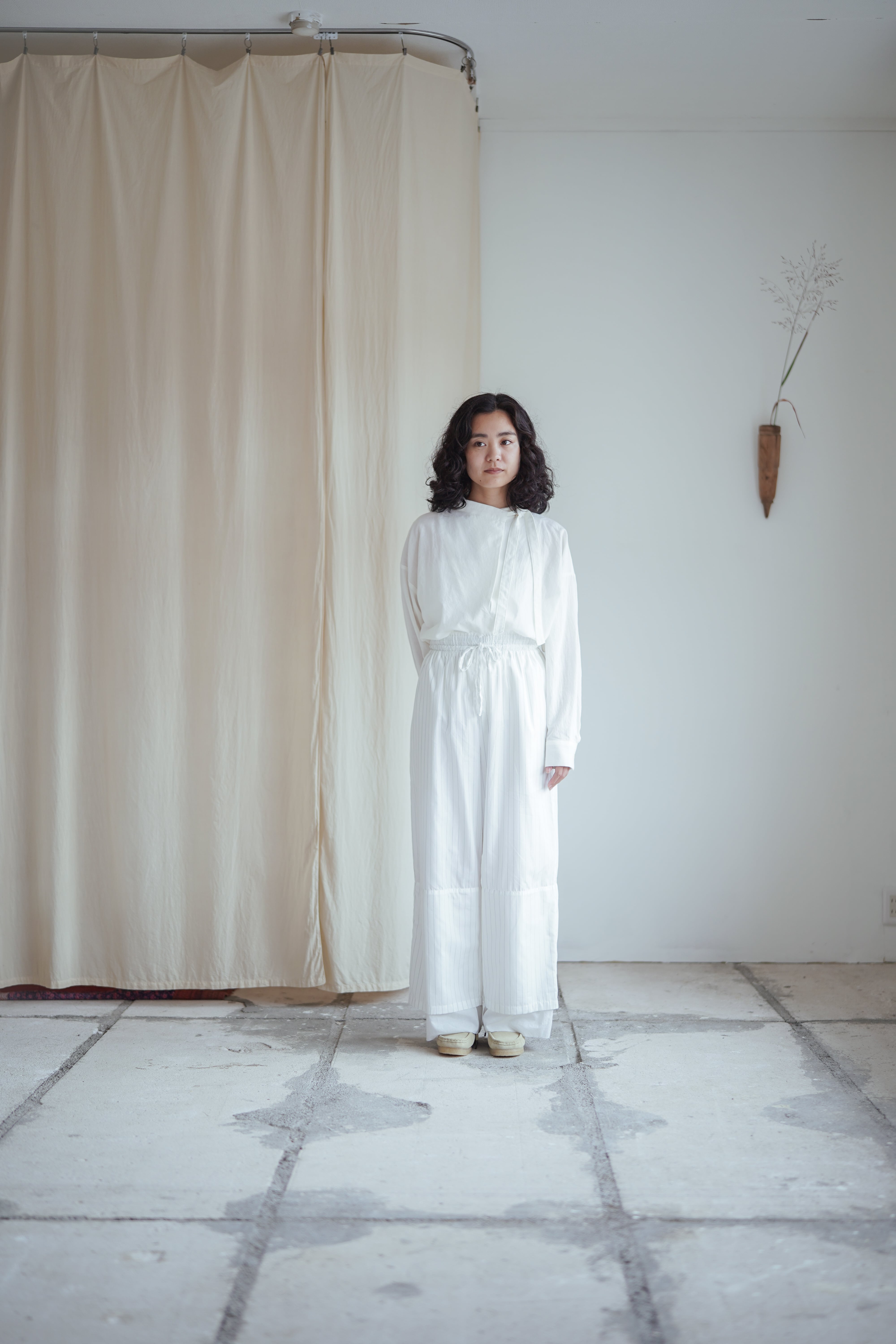 SS25のシーズン素材として、YUGE FABRICから買付したデットストックの2000年代播州織のストライプ柄を作りました。