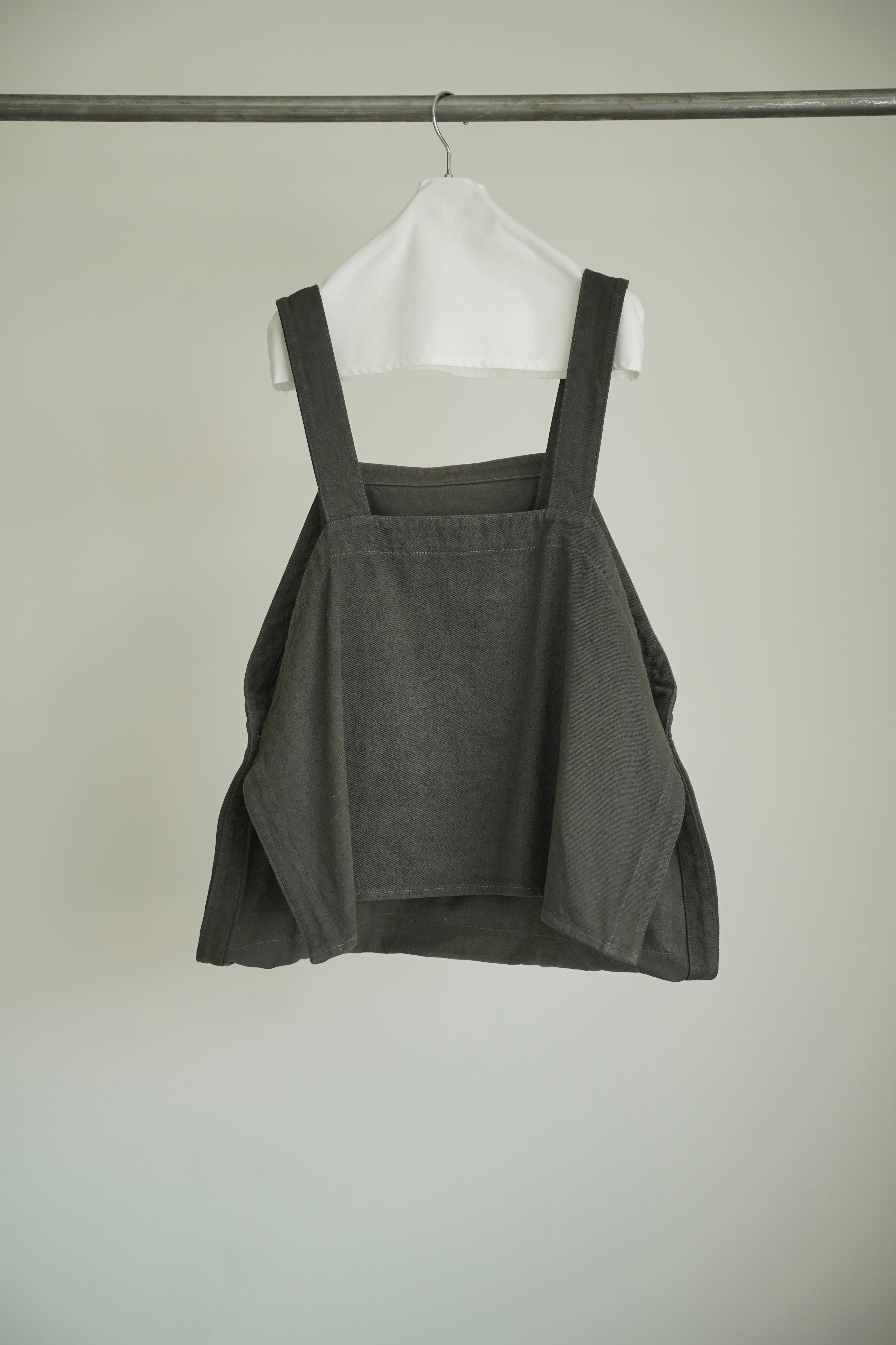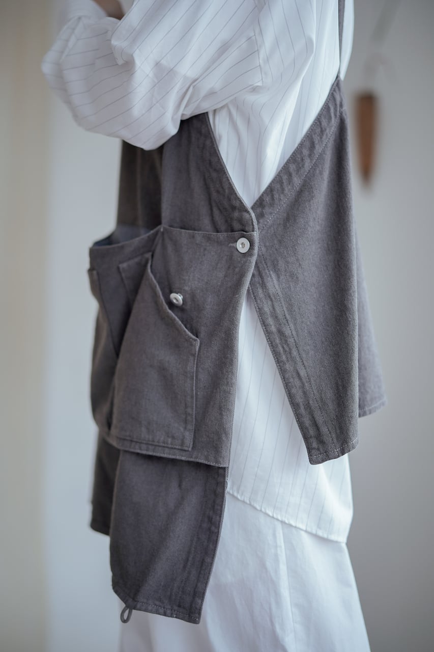 作物の収穫の際に使われるエプロンをモチーフに作った、収穫ベストです。前作からデザイン、素材をアップデートしています。肩紐はボタンホール3箇所で長さ調節。収穫袋として使えるポケットはボタンを外すと底布が垂れて、収穫物を簡単に落とし移すことができます。ポケット内側は汚れが目立ちにくいように黒地にしています。さらに、真ん中には3つの小ポケットがあるので、道具や摘み取った草花入れに。作業用エプロンとしてもお使いいただけます。