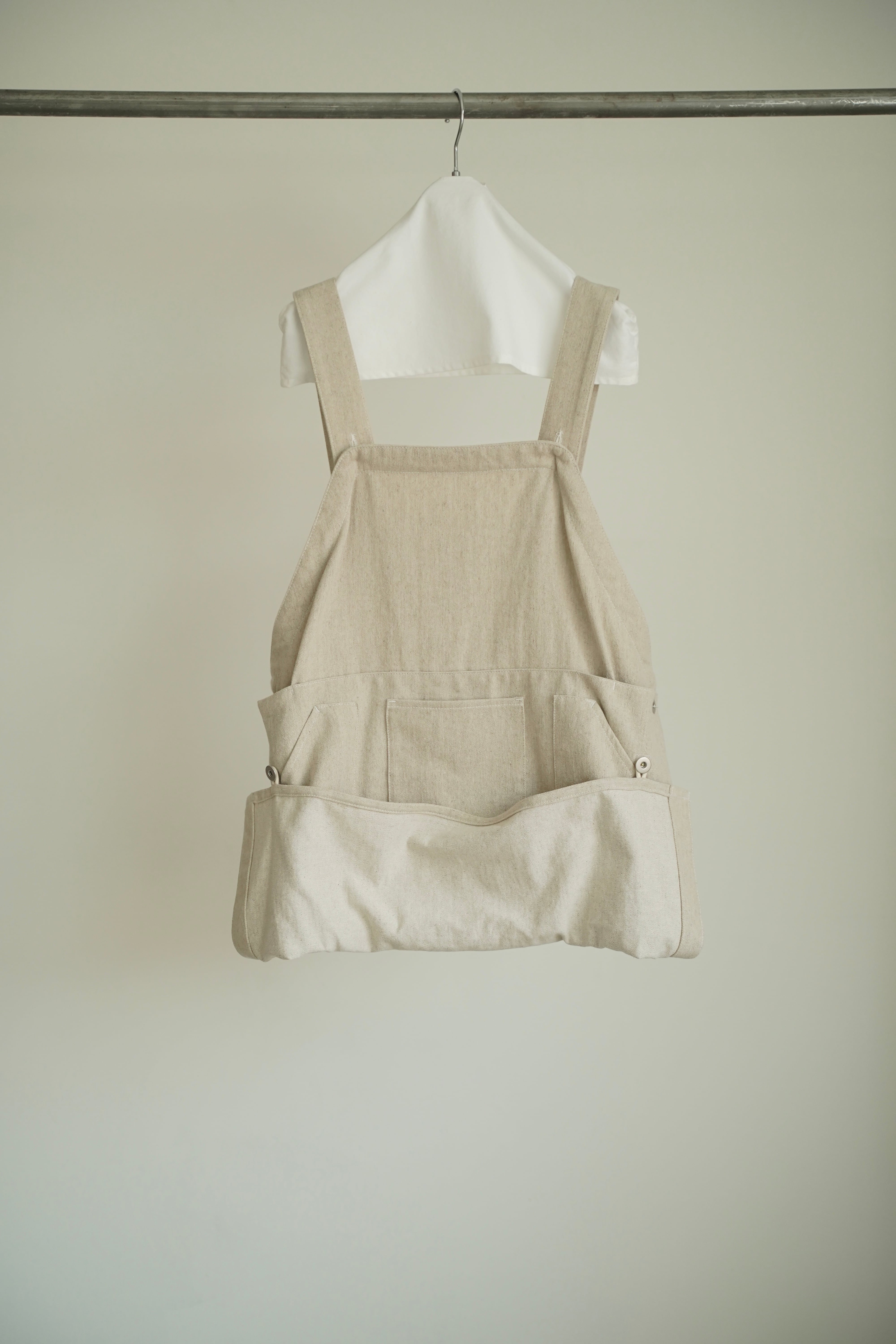 作物の収穫の際に使われるエプロンをモチーフに作った、収穫ベストです。前作からデザイン、素材をアップデートしています。肩紐はボタンホール3箇所で長さ調節。収穫袋として使えるポケットはボタンを外すと底布が垂れて、収穫物を簡単に落とし移すことができます。ポケット内側は汚れが目立ちにくいように黒地にしています。さらに、真ん中には3つの小ポケットがあるので、道具や摘み取った草花入れに。作業用エプロンとしてもお使いいただけます。